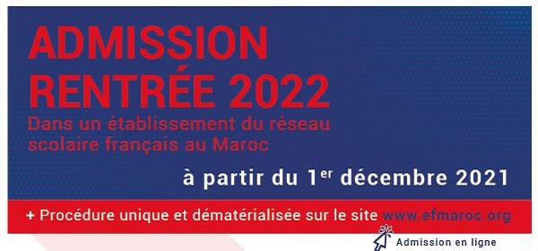 Chers parents, vous êtes désireux d’inscrire votre enfant pour la première fois au sein d’un établissement du réseau scolaire français au Maroc, n’attendez plus, la campagne des admissions pour la rentrée 2022-2023 est ouverte à partir du mercredi 1 décembre 2021. Pour les élèves …